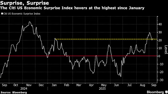 与此同时,花旗美国经济惊奇指数——该滚动指标反映经济数据表现是否超出预期,目前已逼近了1月以来最高水平。